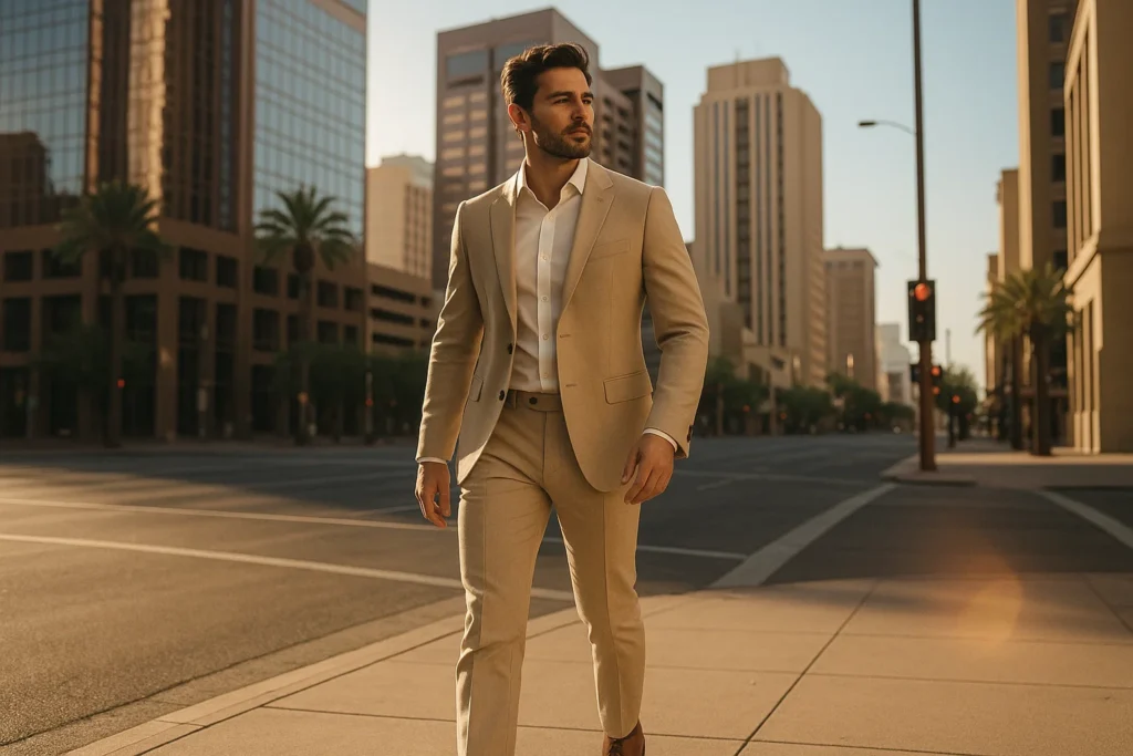The beige color men’s suit is especially suited to Phoenix’s desert tones and warm light. The soft neutral hue mirrors the natural landscape and pairs seamlessly with the city’s year-round sunshine. During spring and summer, lighter linen or cotton versions keep you cool and comfortable. In fall or mild winter months, wool or textured blends give your beige suit extra structure and warmth.
